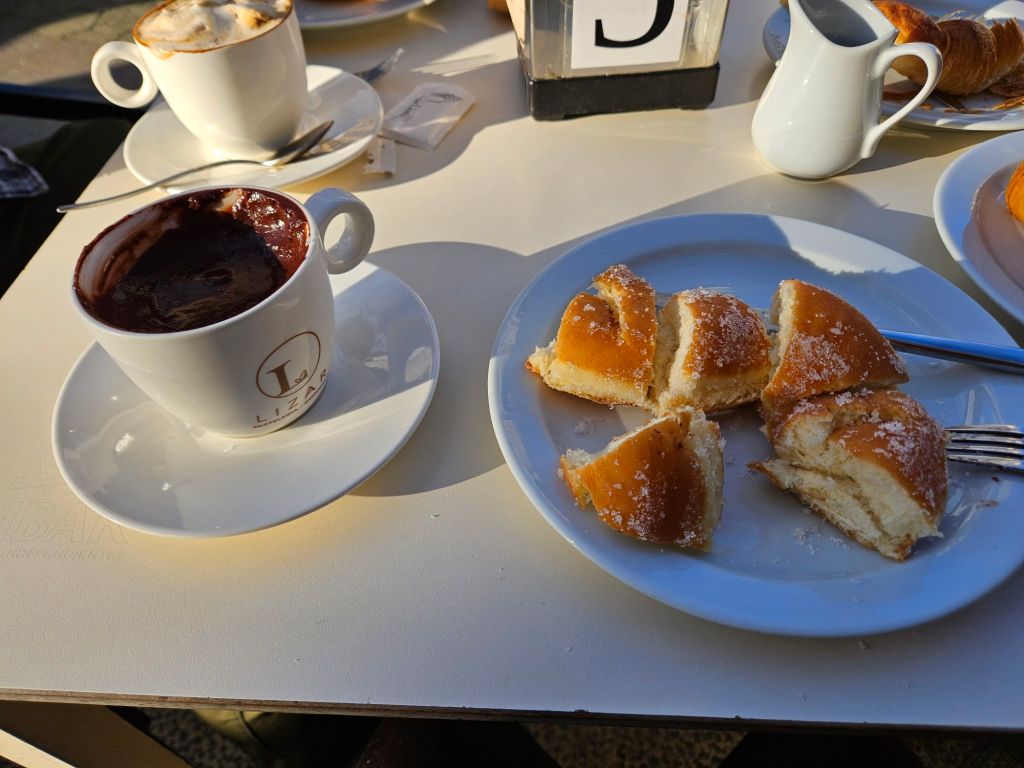 I completely forgot that in Spain if you want regular hot chocolate you have to ask for ColaCao (Spanish version of Nestlé Quilk). If you ask for hot chocolate, what you actually get is a mug of undrinkable melted chocolate. Which is what I ended up with. Thankfully Scott and I had big doughnuts to dip into it.