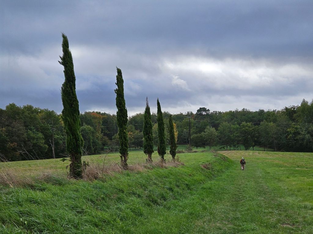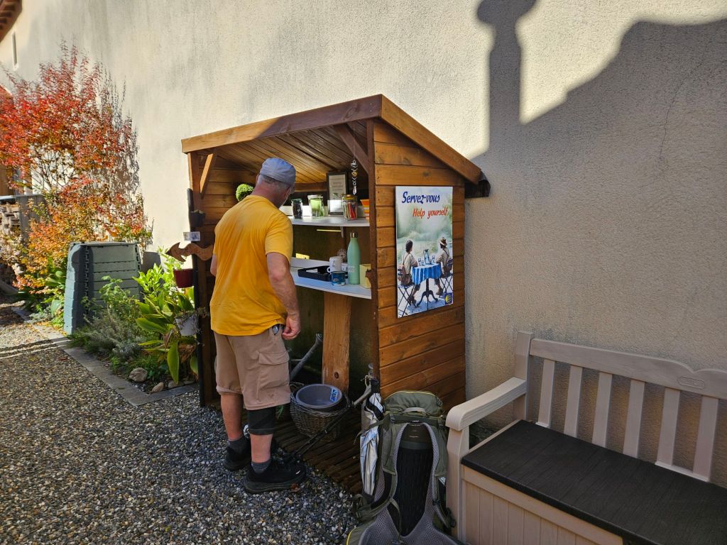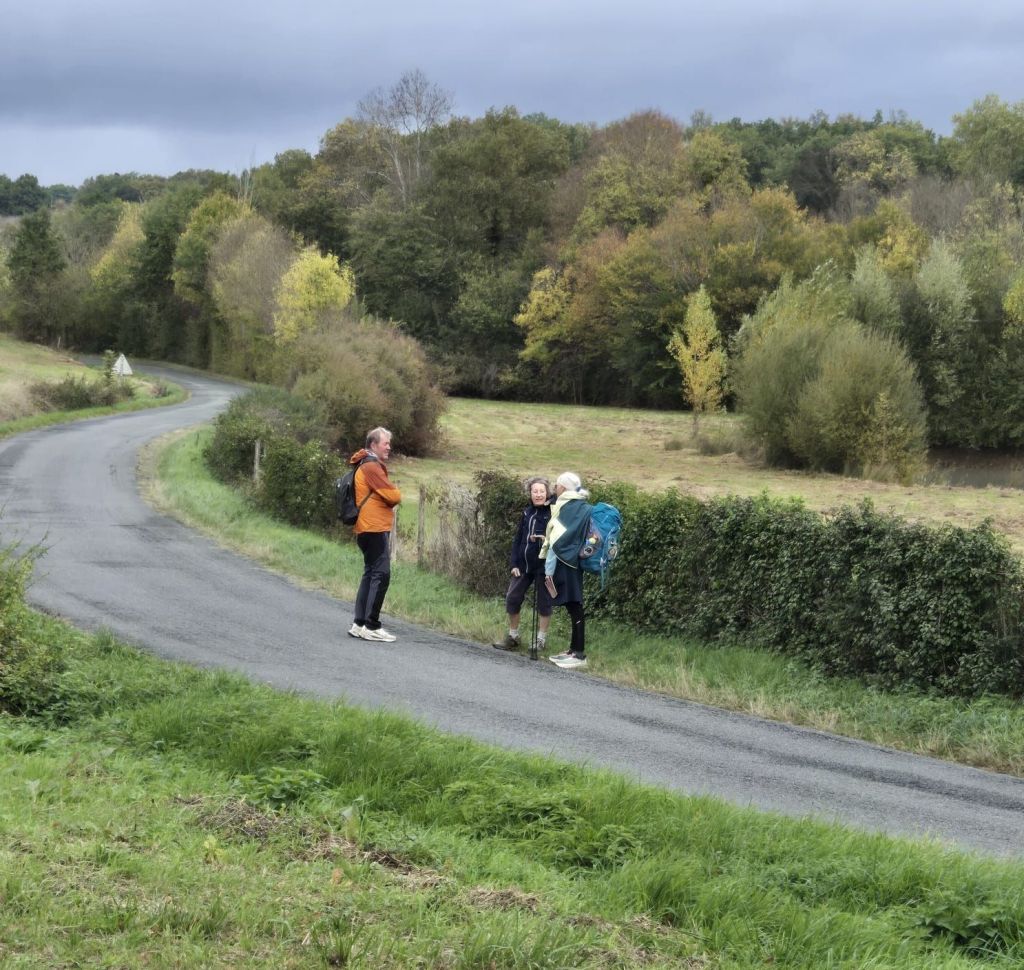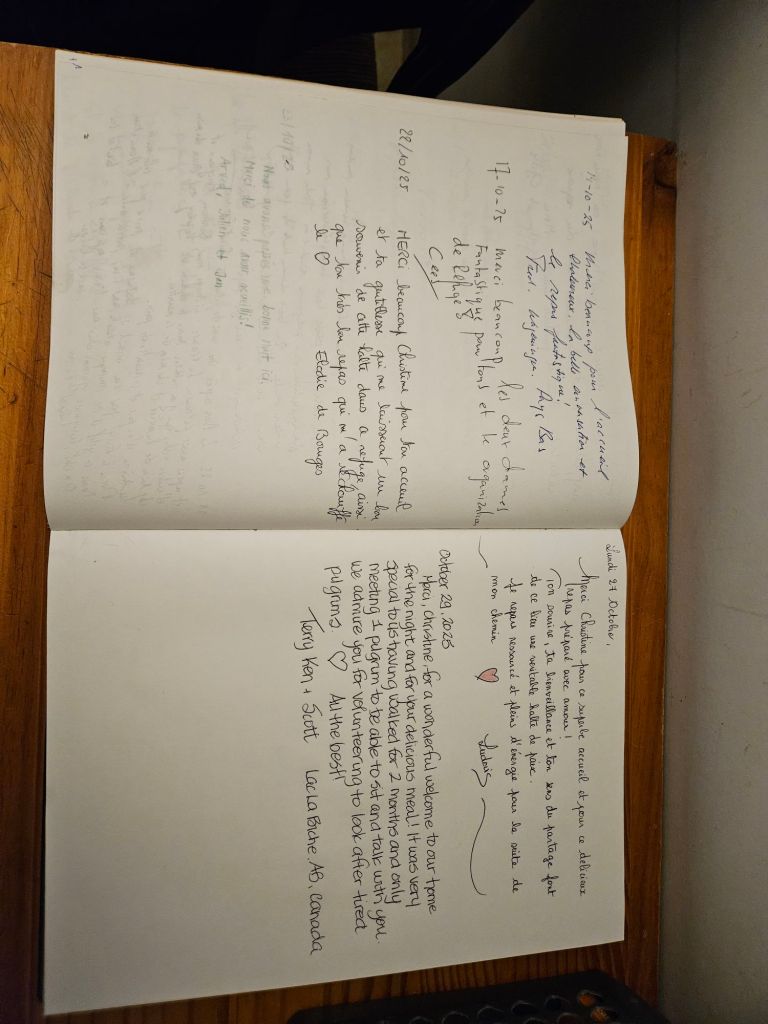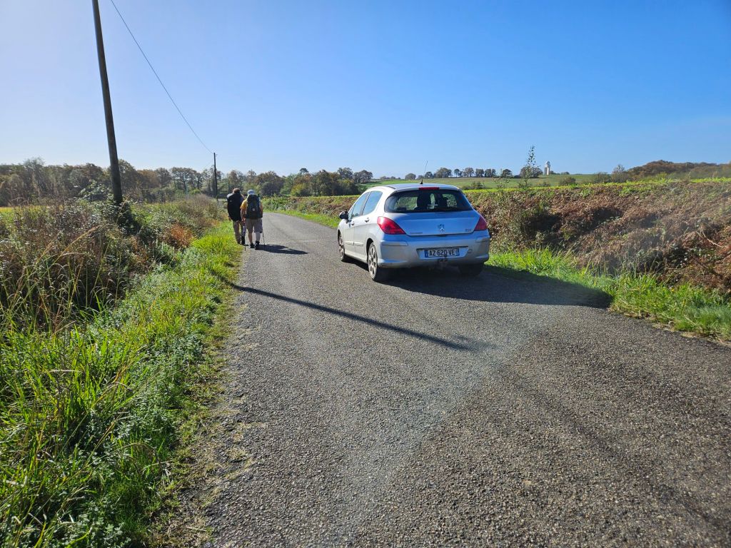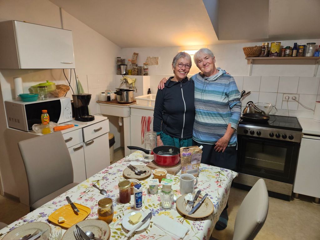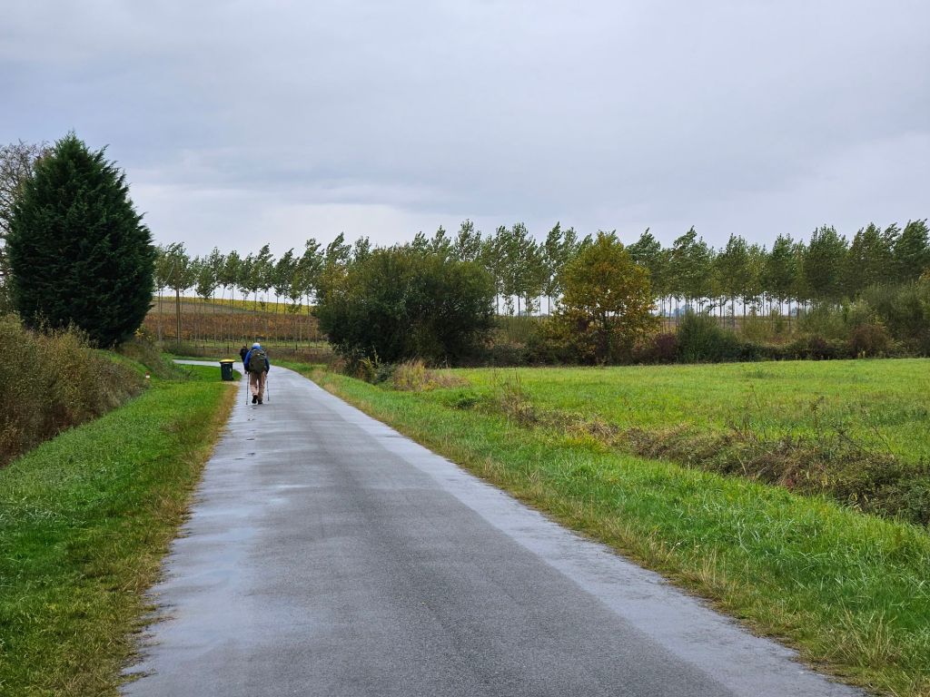 We had an enjoyable breakfast with the Irish couple in anticipation of a 22 km hilly day. The breakfasts here are usually only baguette, croissant or toast with coffee, tea or hot chocolate. And plain yoghurt and sometimes apple sauce. I don’t know what’s with the plain yoghurt but I think the intent is to add the jam or honey of your choice. But on these farm places the jams and juices, even honey, are often made on site or at least local. Peanut butter is not a thing here but Nutella is huge! Today there were hard boiled eggs and we pocketed them for our lunch (during which Ken’s fell into pieces when he tried to peel it and I spit mine out it was so gamey and inedible – not sure what those chickens were eating 😬)