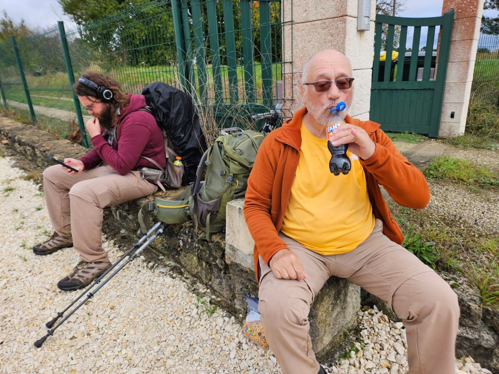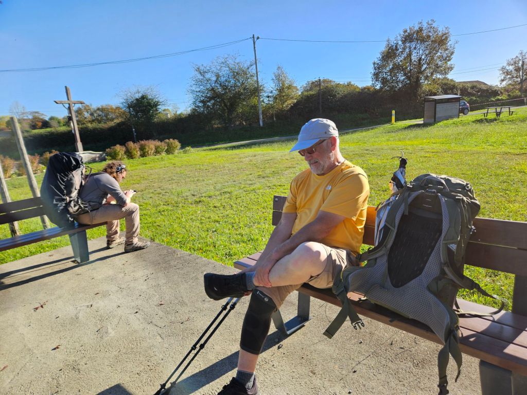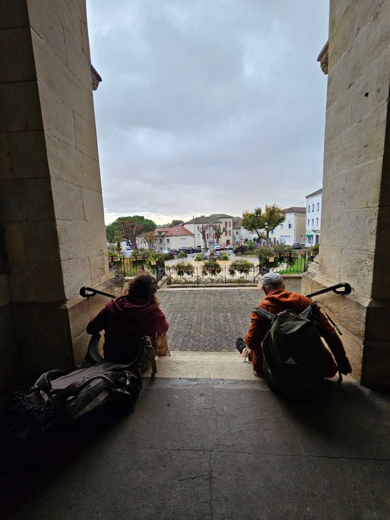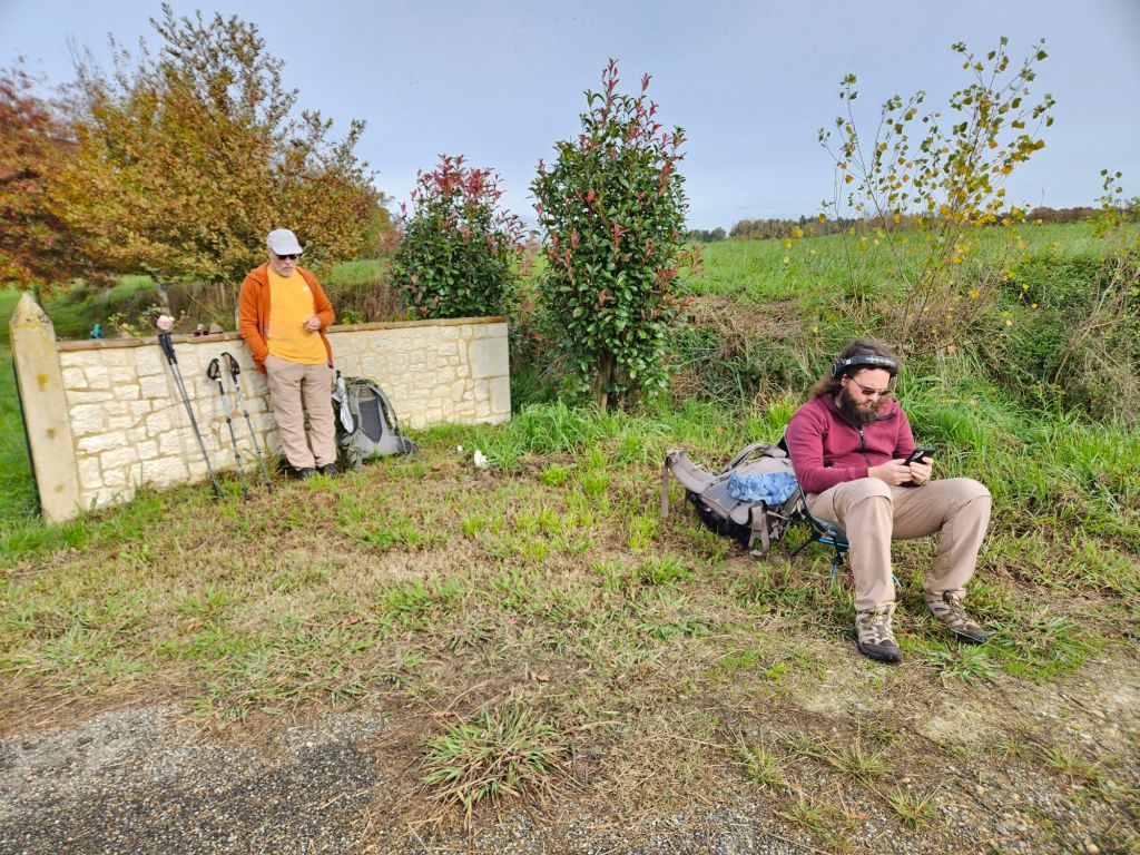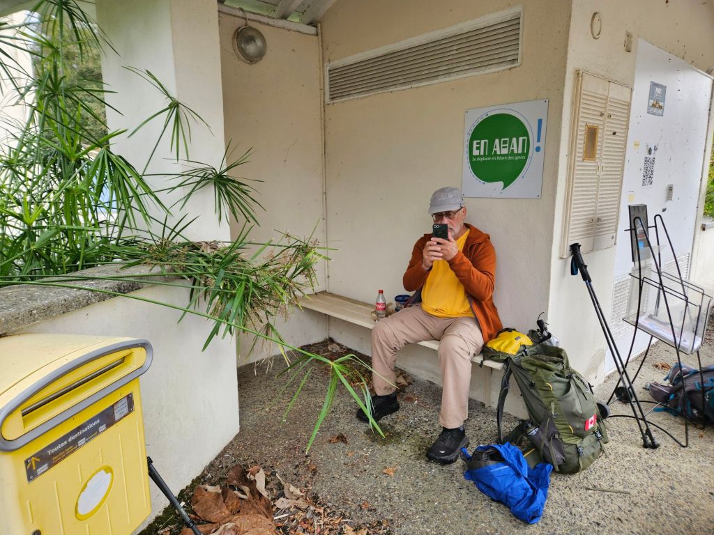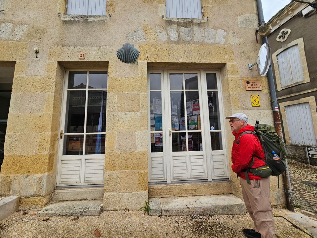 Lunch time at Chez Bus Shelter. Where the hard boiled eggs were found to be of dubious quality. On the other hand, the Mairie was supposed to close at 1230, we got there at 1233, and the lady was kind enough to give us our pilgrim stamps.