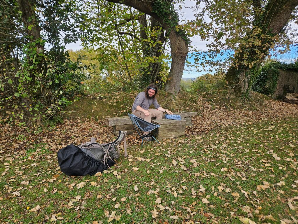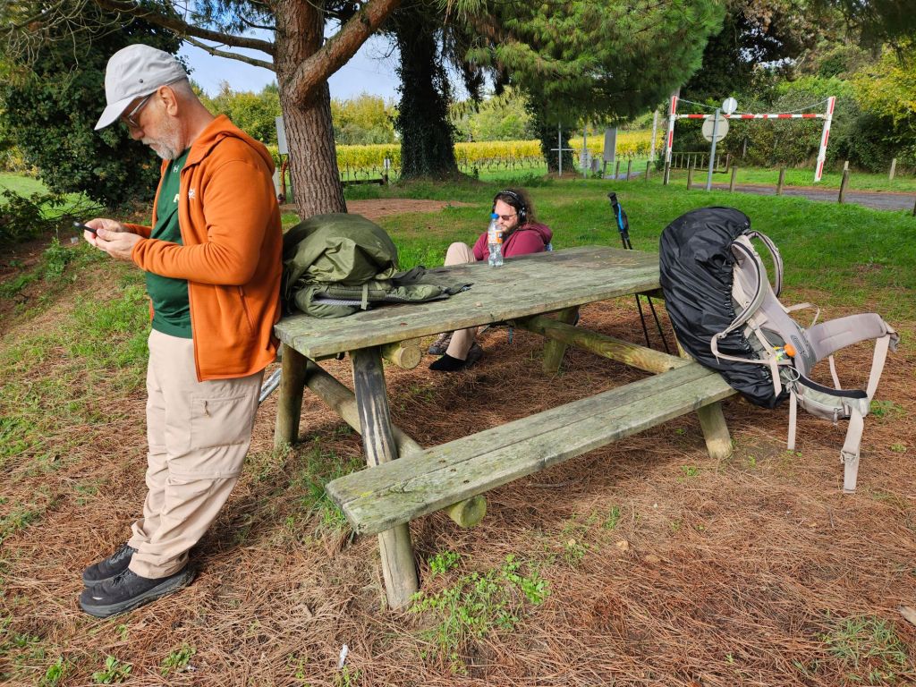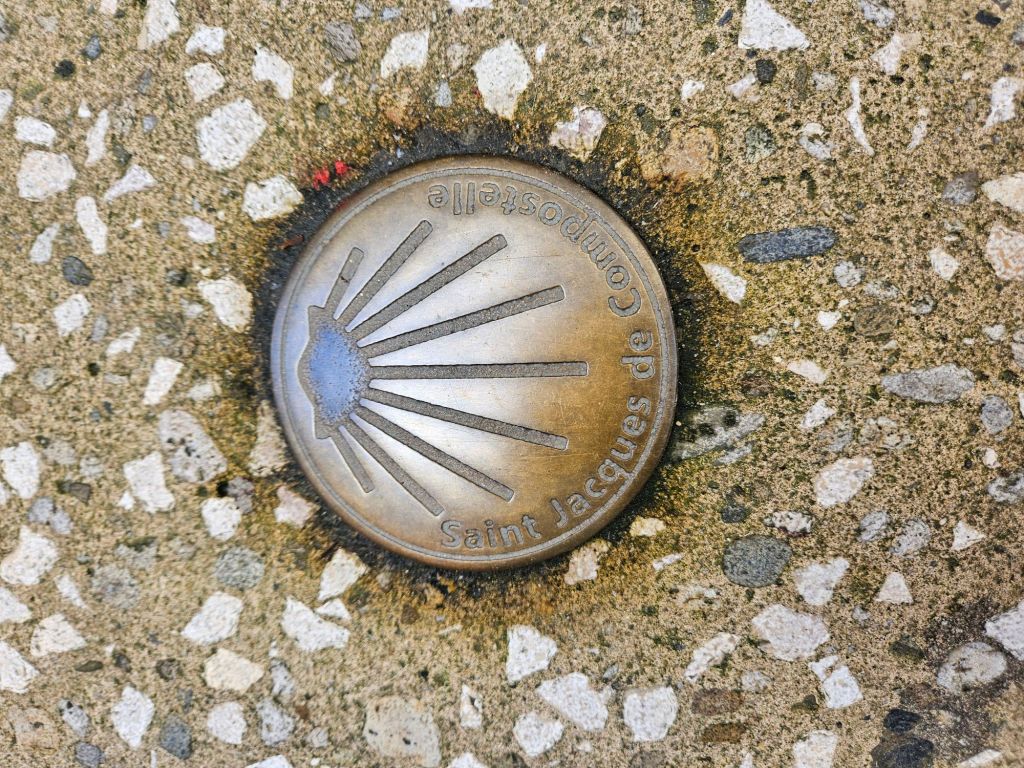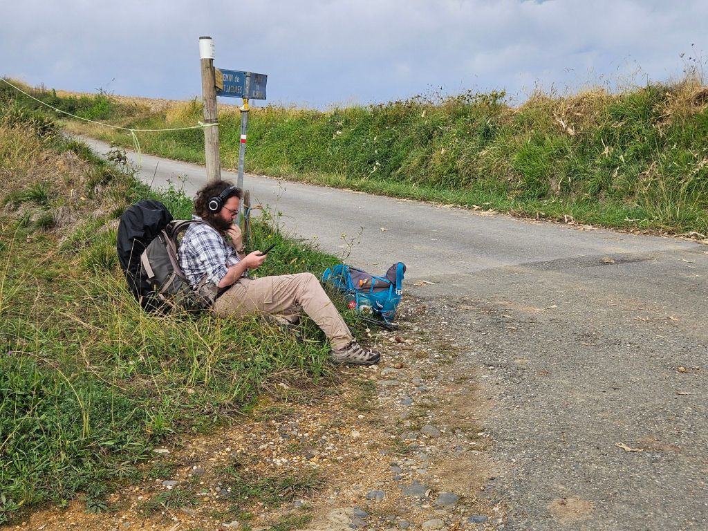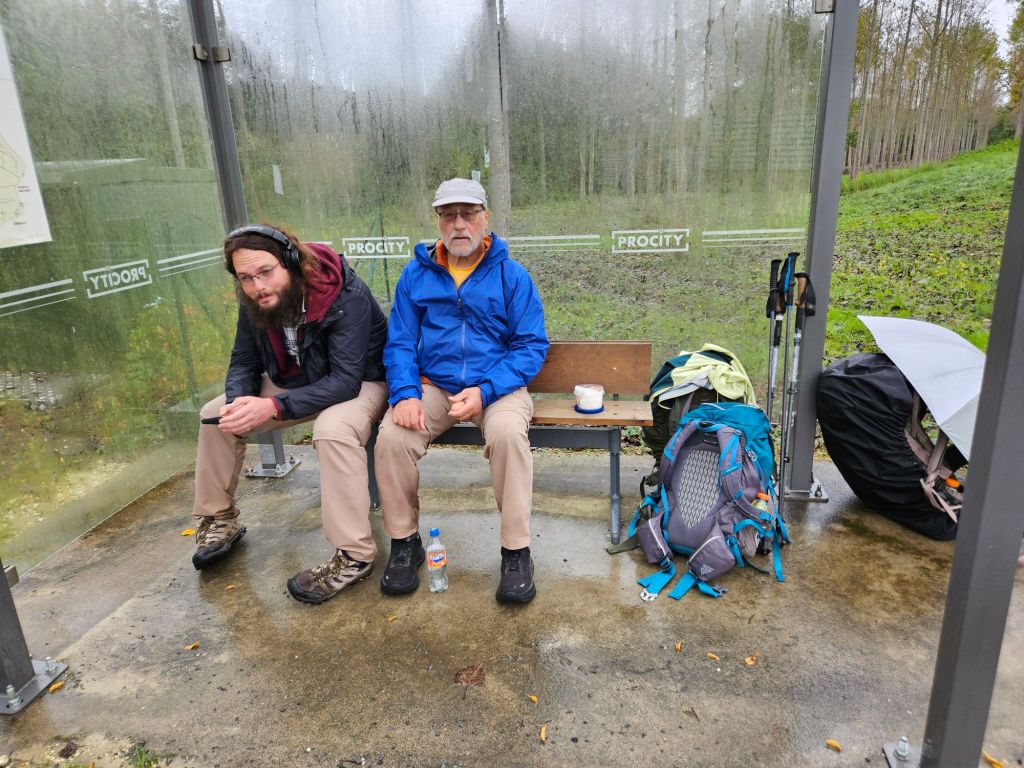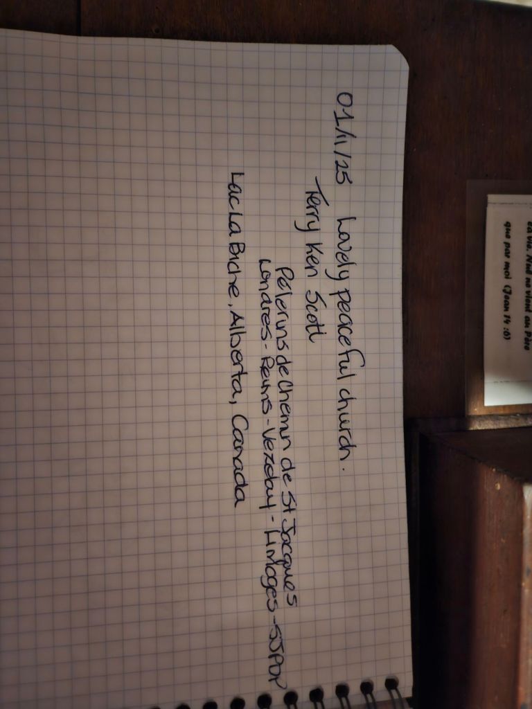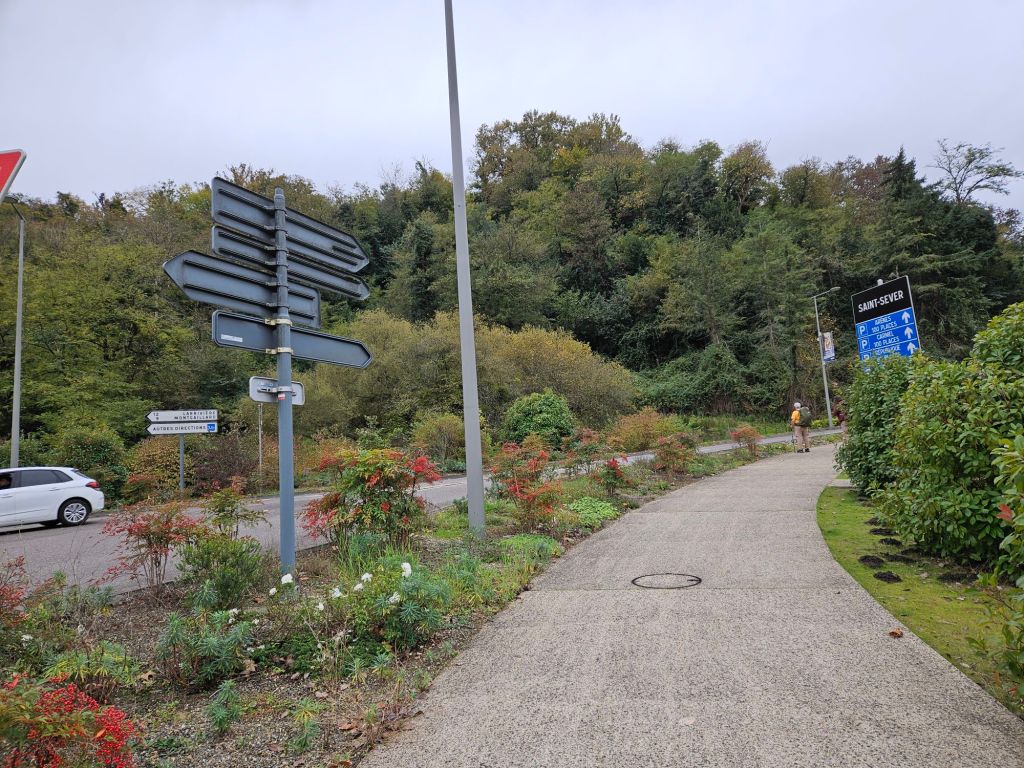 Lunch time at Chez Bus Shelter. Where the hard boiled eggs were found to be of dubious quality. On the other hand, the Mairie was supposed to close at 1230, we got there at 1233, and the lady was kind enough to give us our pilgrim stamps.