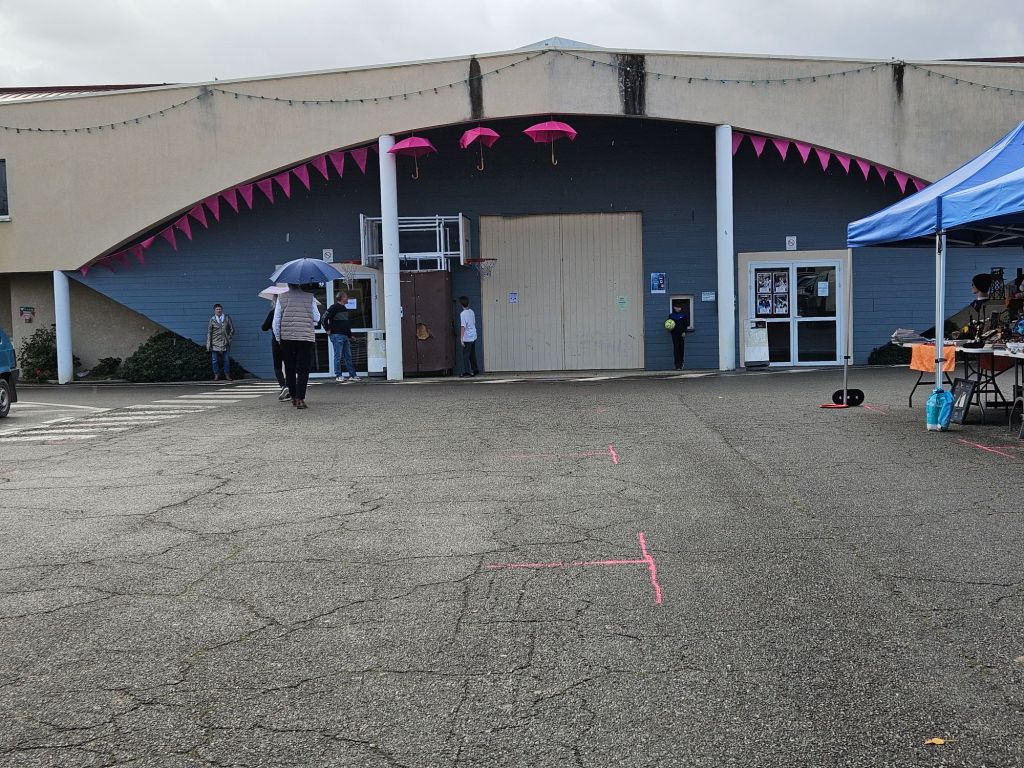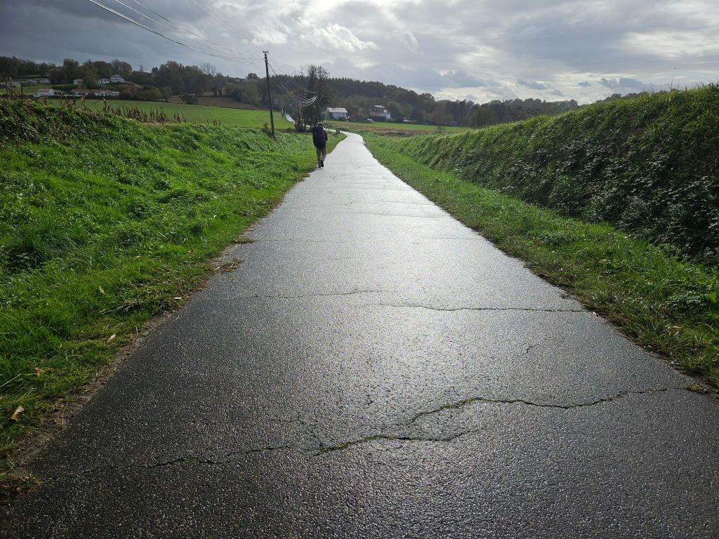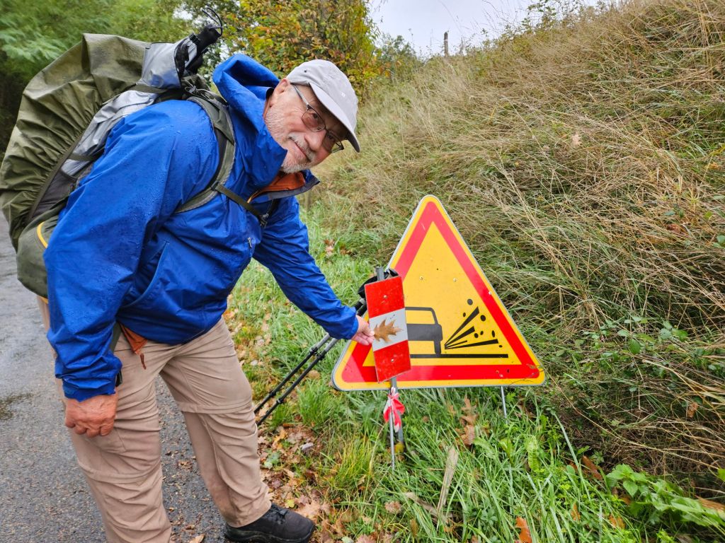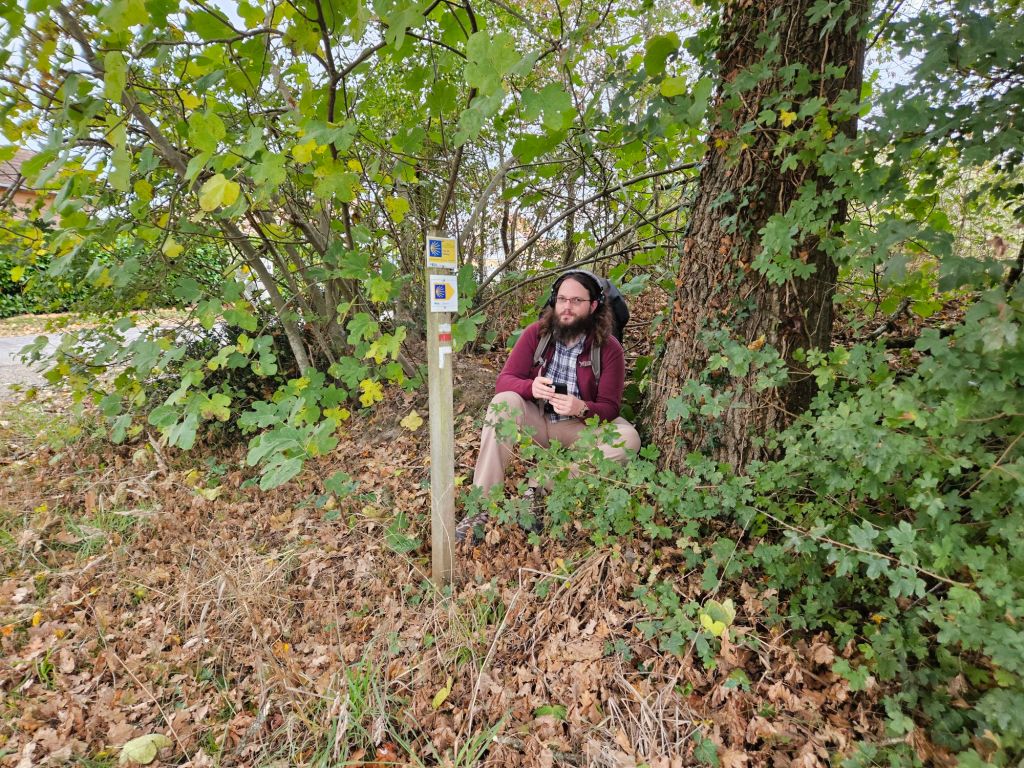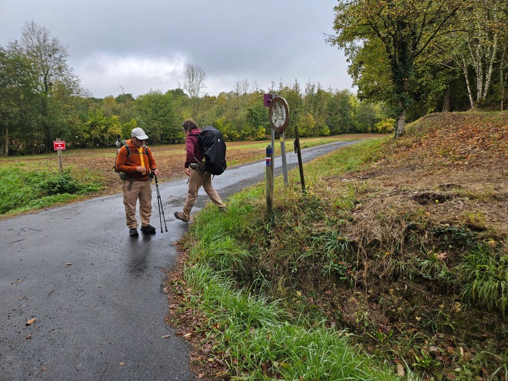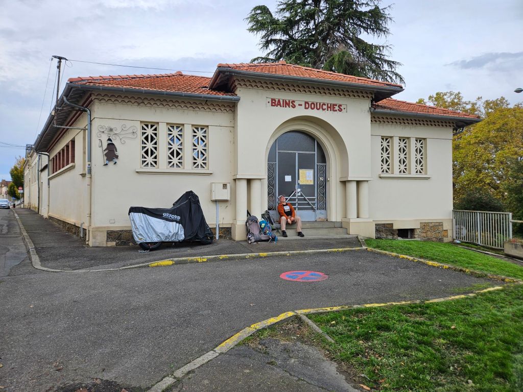 Lunch time at Chez Bus Shelter. Where the hard boiled eggs were found to be of dubious quality. On the other hand, the Mairie was supposed to close at 1230, we got there at 1233, and the lady was kind enough to give us our pilgrim stamps.
