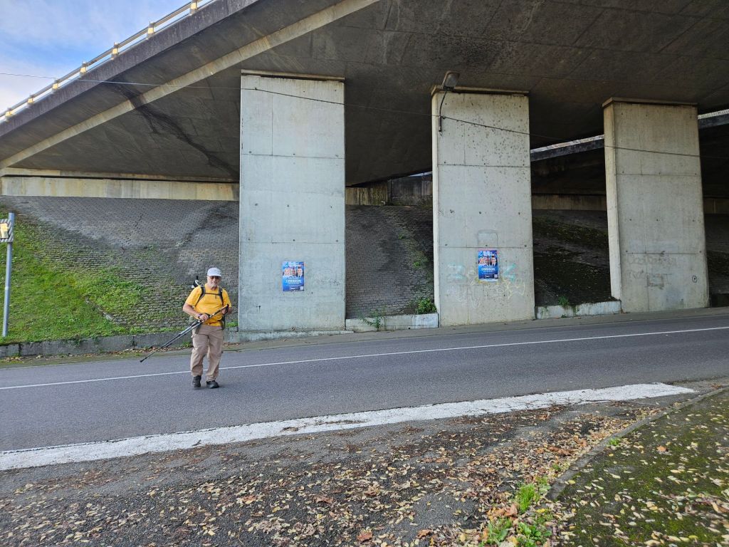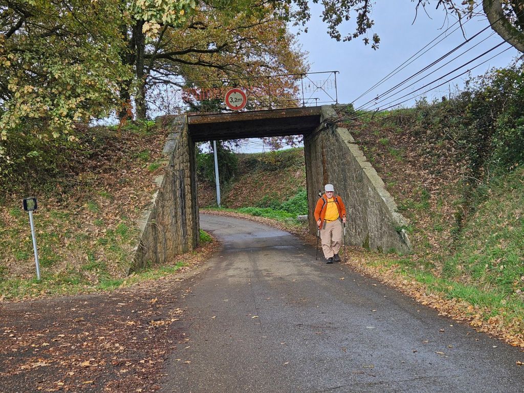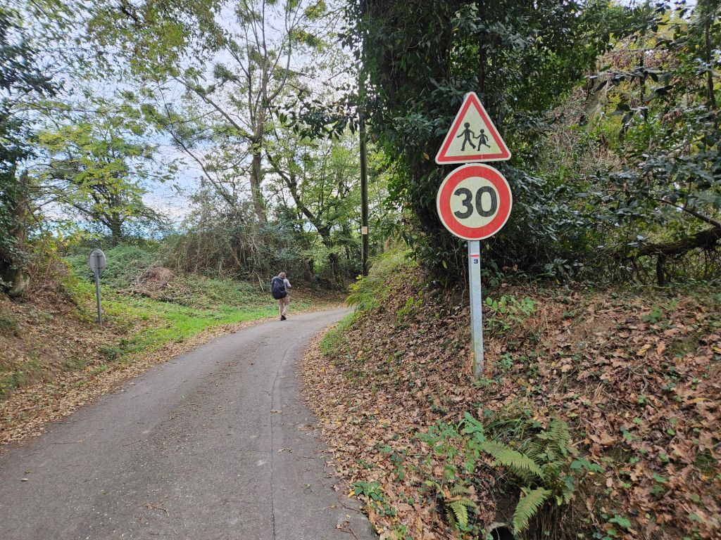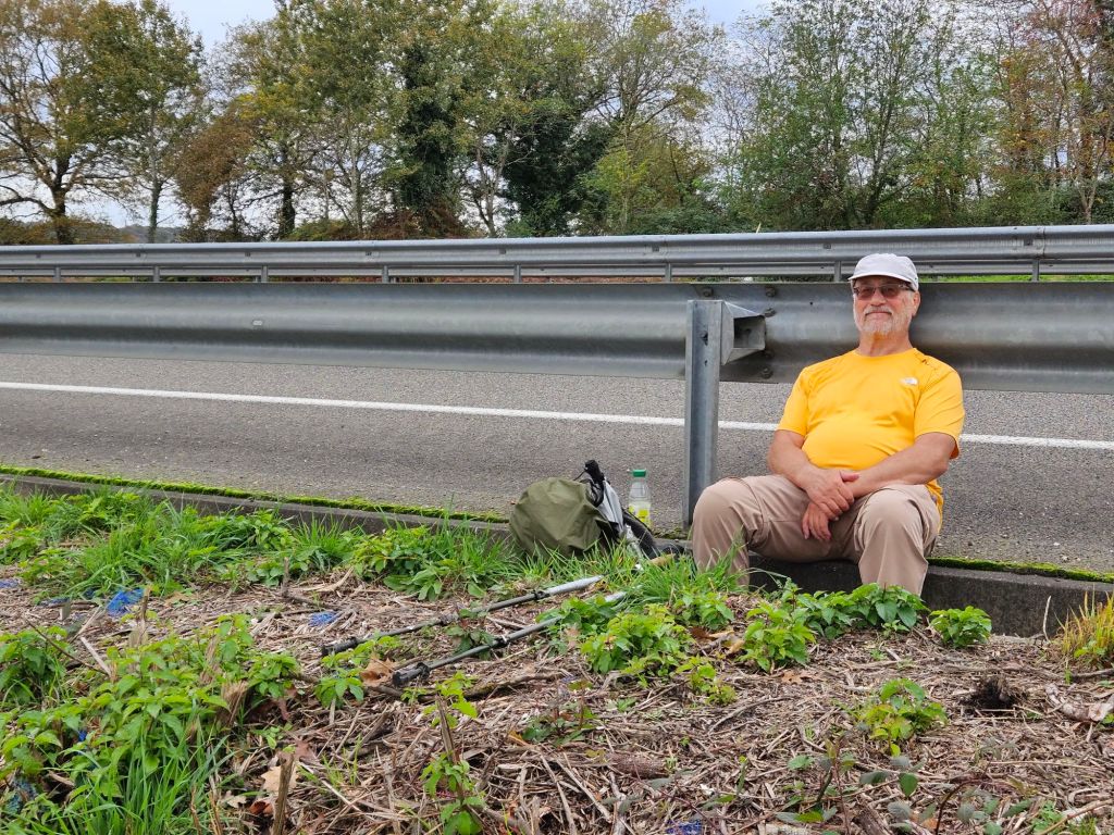 Walk behind the barrier and not on the grinder. They should do this more often. We hate grinders (Peter’s word for busy roads that we have to walk down.