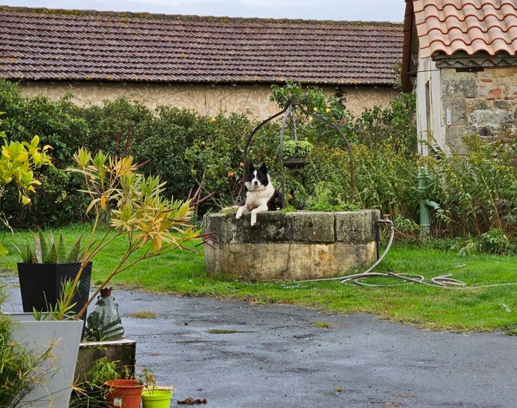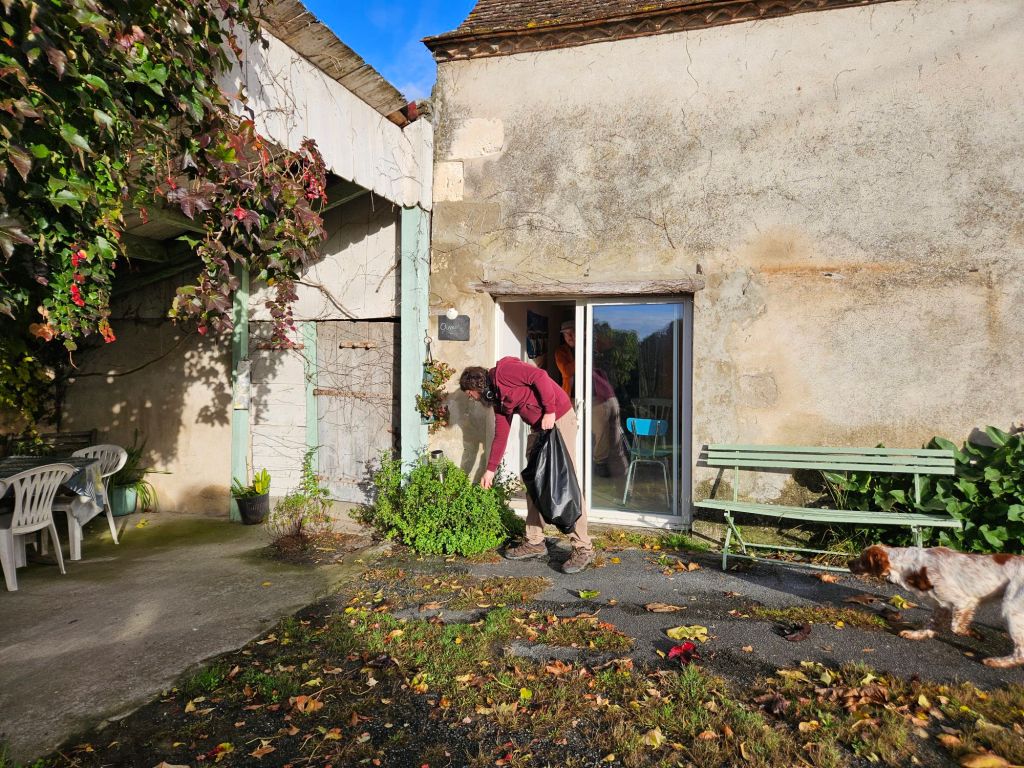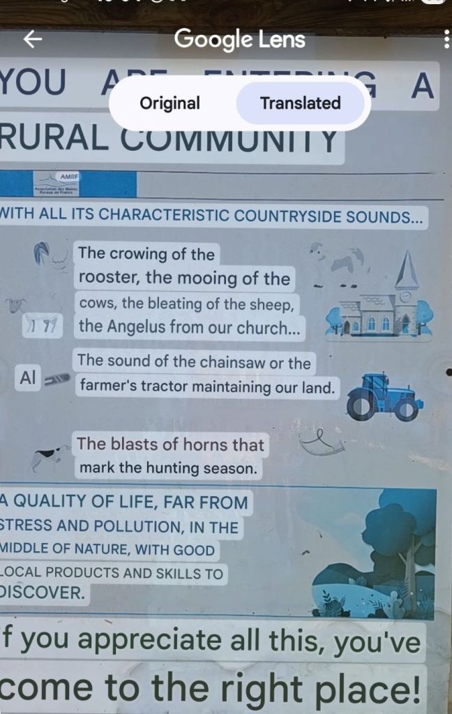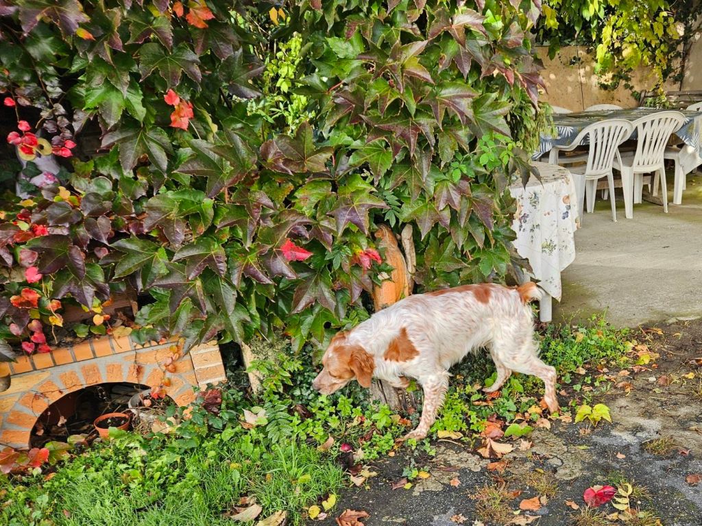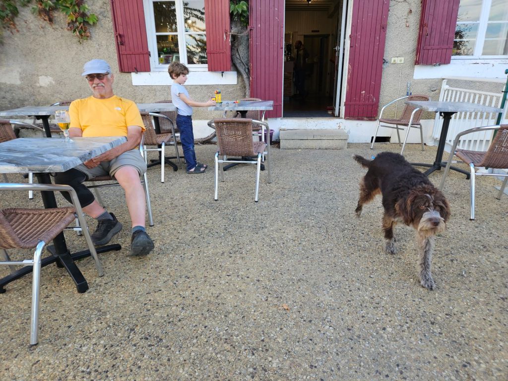 This springer spaniel was running around the yard while the two we knew lived here were tied up. Hmmm. We got to a house about 1/2 km down the road and there was a frantic lady in the street and a man in a car. She asked (in French) if we had seen a spaniel and I was able to tell her (in French) that it was up at the gite. Just then another vehicle came up also looking for the dog. They were worried it would get on the main road because the cars drive too fast and there are many hunters around. Glad we could help.